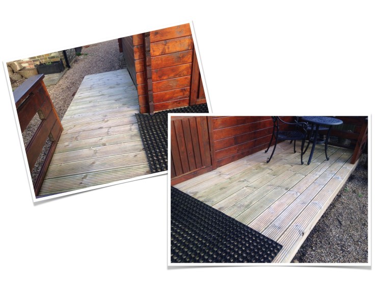 First, we have had the wooden decking and ramp around our pine cabin all pressure washed and nicely cleaned.