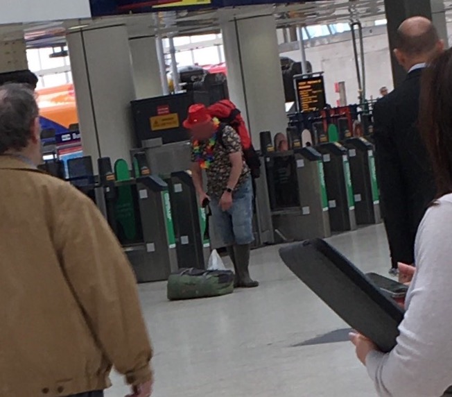 Finally with all the terrorist worries, whilst sitting at the station on my rollator waiting for our train in London, I heard the tannoy announcer say “If you spot anything suspicious please report it immediately“, I noticed this guy, and alerted the authorities (No. 56 – Being vigilant!) I saw him being escorted to Bragg’s security checks! What did he expect? Welly boots, bright shirt and flowers etc. Apparently he was going to the Isle of Wight festival. An unlikely story!