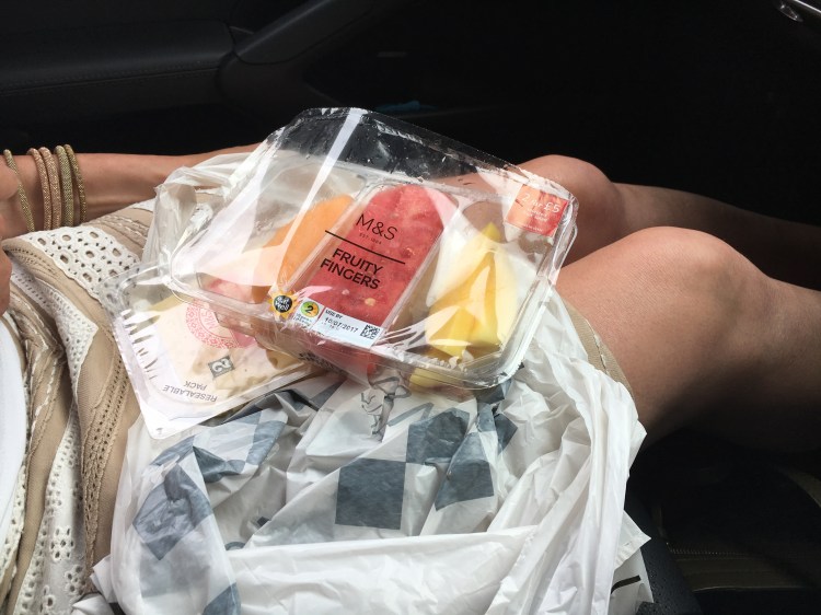 This time, whilst in traffic, I suddenly saw a Marks and Spencer’s food store at a fuel station. I immediately pulled off in typical Ayton Senna style, got out and refuelled the car. Jean went off and paid, whilst I staggered to the loo. We then stocked up with some sandwiches. We left, departed the motorway, and drove into a small village, parked up and enjoyed our feast. Mind you I think M&S need to double check their product names. Jean got these..