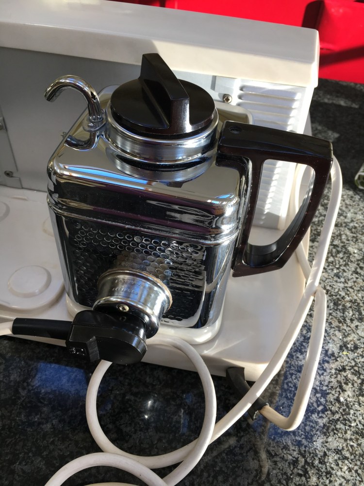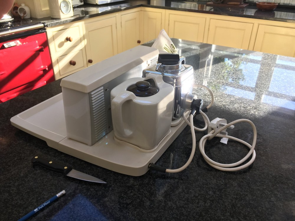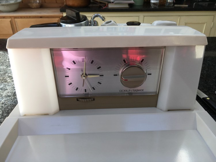 It is a 1971 Goblin Teasmade! Yes readers, as an all out danger and action couple, Jean and I were discussing the old teasmade that we borrowed from my Mum 35 years ago whilst we were at University. We then searched eBay and found an exact match!! So we bought one!