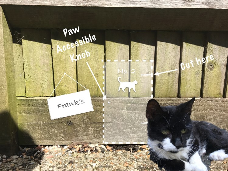 What’s been happening in our mad household this week? In addition to having two dogs, we also home a lovely cat. Recently, our new neighbours have been keeping their garden gate firmly closed and so our cat, Frank, has not been able to do that thing that cats do in your neighbour’s garden (“yard”for my American friends)! How cheeky. With the typical swagger of a cat, I was presented with this building request by Frank…..