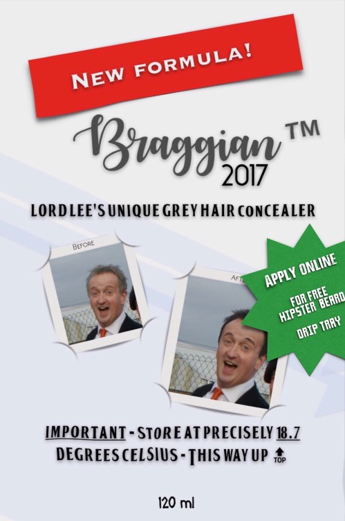 And Lord Bragg sold loads of his Braggian 2017 Grey Hair Concealer along with his new Slaphead Shine* to the follically challenged audience! What a guy!