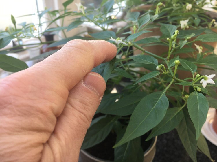 It is vitally important, as chilli plants are self-pollinating (fertilising), that you create a breeze around the stamens of the flowers if your plants are in the house. Or even better actually touch the stamens to create a puff of pollen! If you need to do this, do it now before it’s banned!