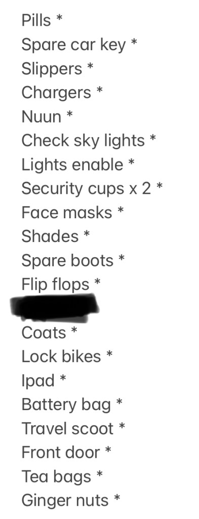 Checklists are central to an enjoyable, stress free and above all, good spousal relation’s time away. If one manages to get to the end of the road still talking, that’s an achievement, I say! That’s why I always take a belt, braces and string approach. I even have a last minute checklist before rollating out the back door and the final lock up! Here is a segment of my most recent list…