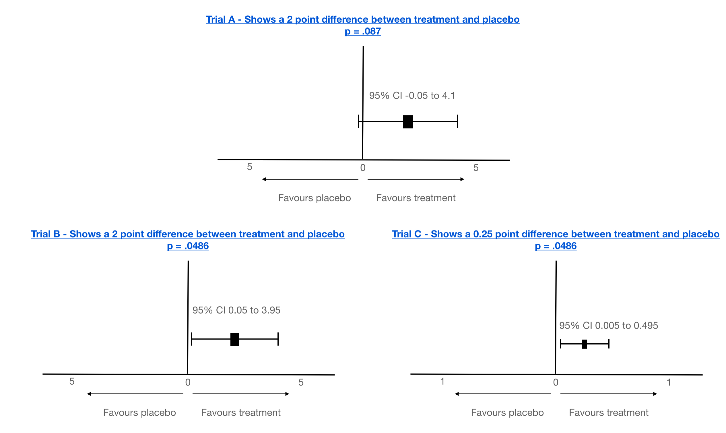 Take for example the following examples that show the results of analysis of a specific ALSFRS-R points difference observed at the end of three hypothetical trials. Adding the 95% confidence intervals (CIs), adds some more, but only a little, context. Is it a bit clearer? Perhaps. What about example C, with its p = .0486? Is the effect actually clinically significant, despite statistical significance? Note, also, how I have also used a different scale in C. Makes it look more significant, perhaps? But A and B look quite compelling, don’t they? However, the CIs are pretty wide?