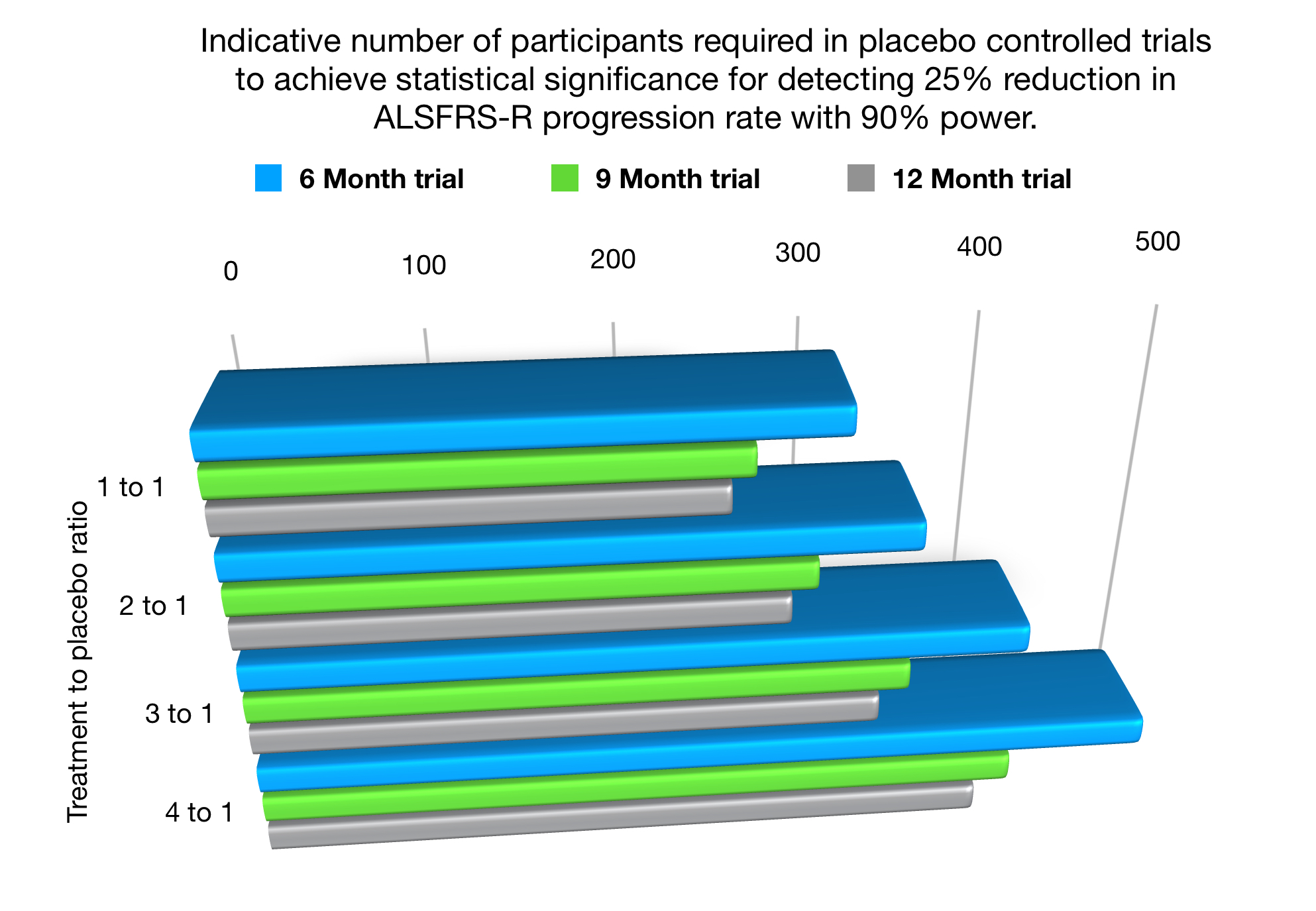 There are several excellent papers available that detail the calculations necessary to estimate the patient numbers based on the effect size that is to be detected, length of trial, significance level, power, patient variability and fall out rate as the primary factors. For example, Ruben van Eijk’s 2018 paper. I have created a little chart to give a feel for the total number of participants required for a placebo controlled trial (numbers are the total number required, ie combined placebo and treatment) powered at 90% (ie only a 10% chance of missing an effective treatment signal) and detecting a 25% difference in ALSFRS-R progression rate. My thanks go to Ruben van Eijk for confirming the indicative numbers based on his paper.